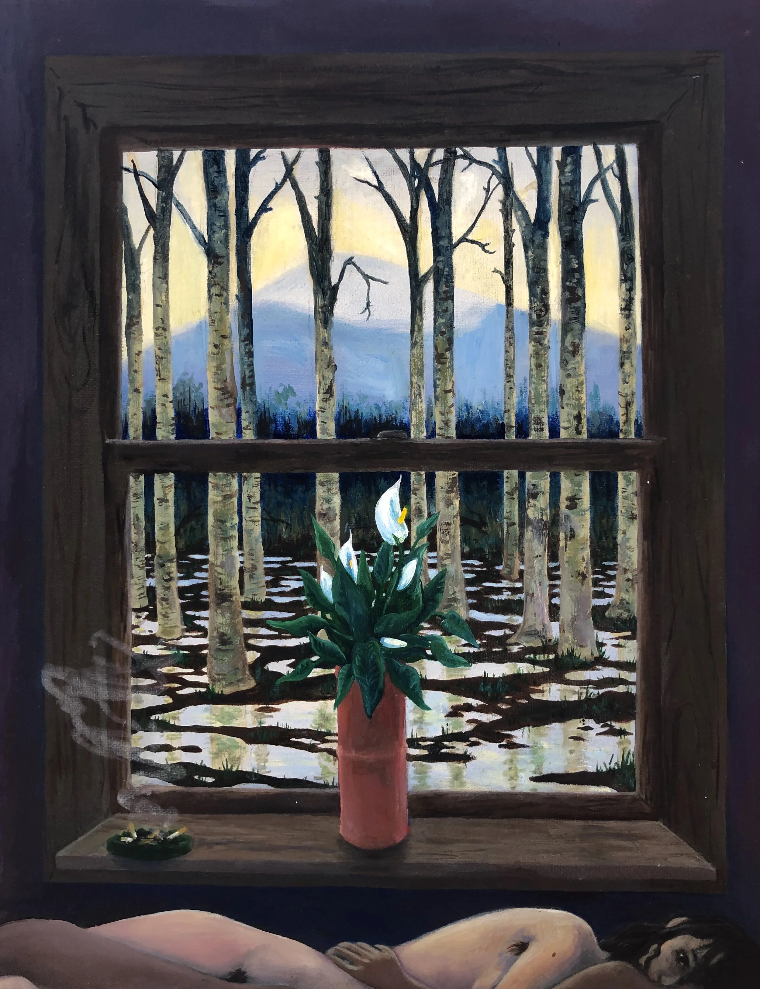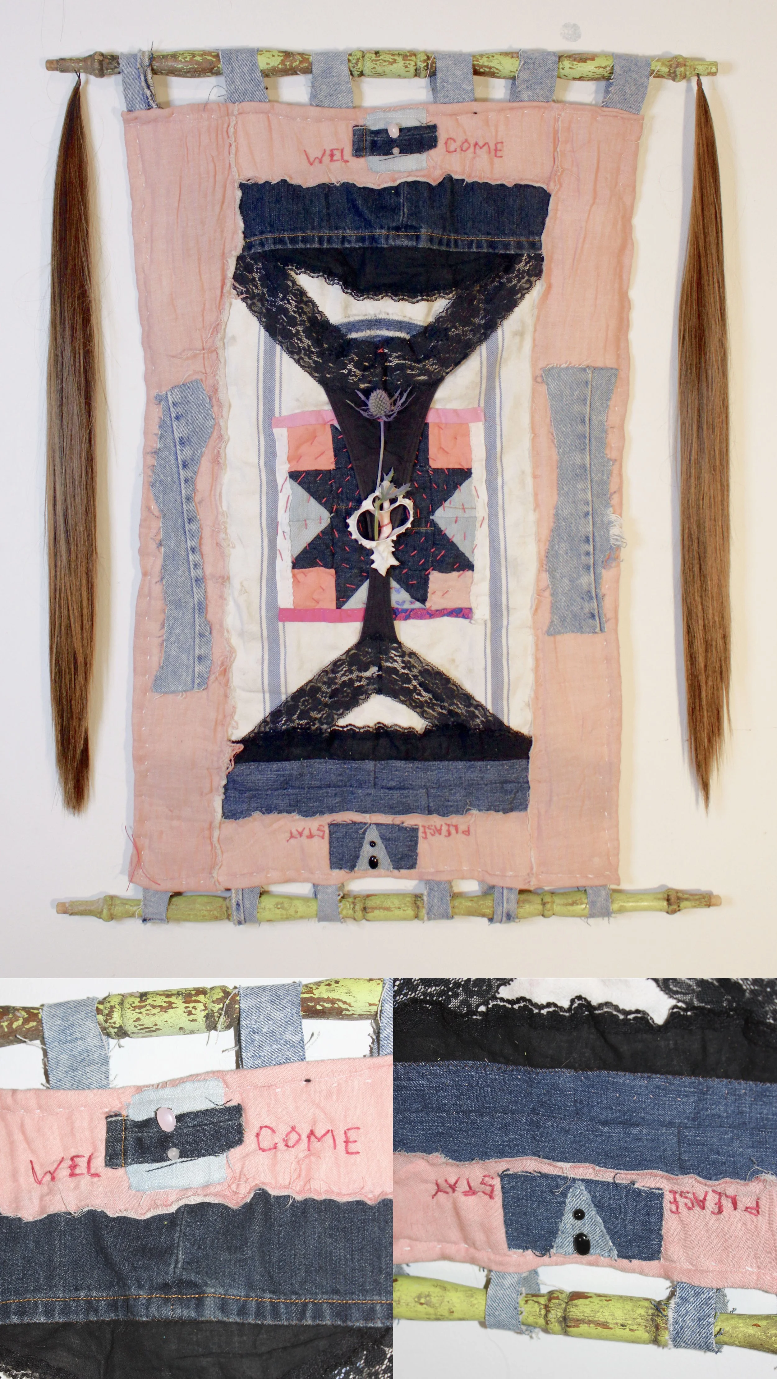 denim, bed sheets, dish rag, cotton lace thong aged by 14 years, recovered bannisters, hair extensions, found organic materials, rose quartz and onyx belly ring piercings. 33”×27”