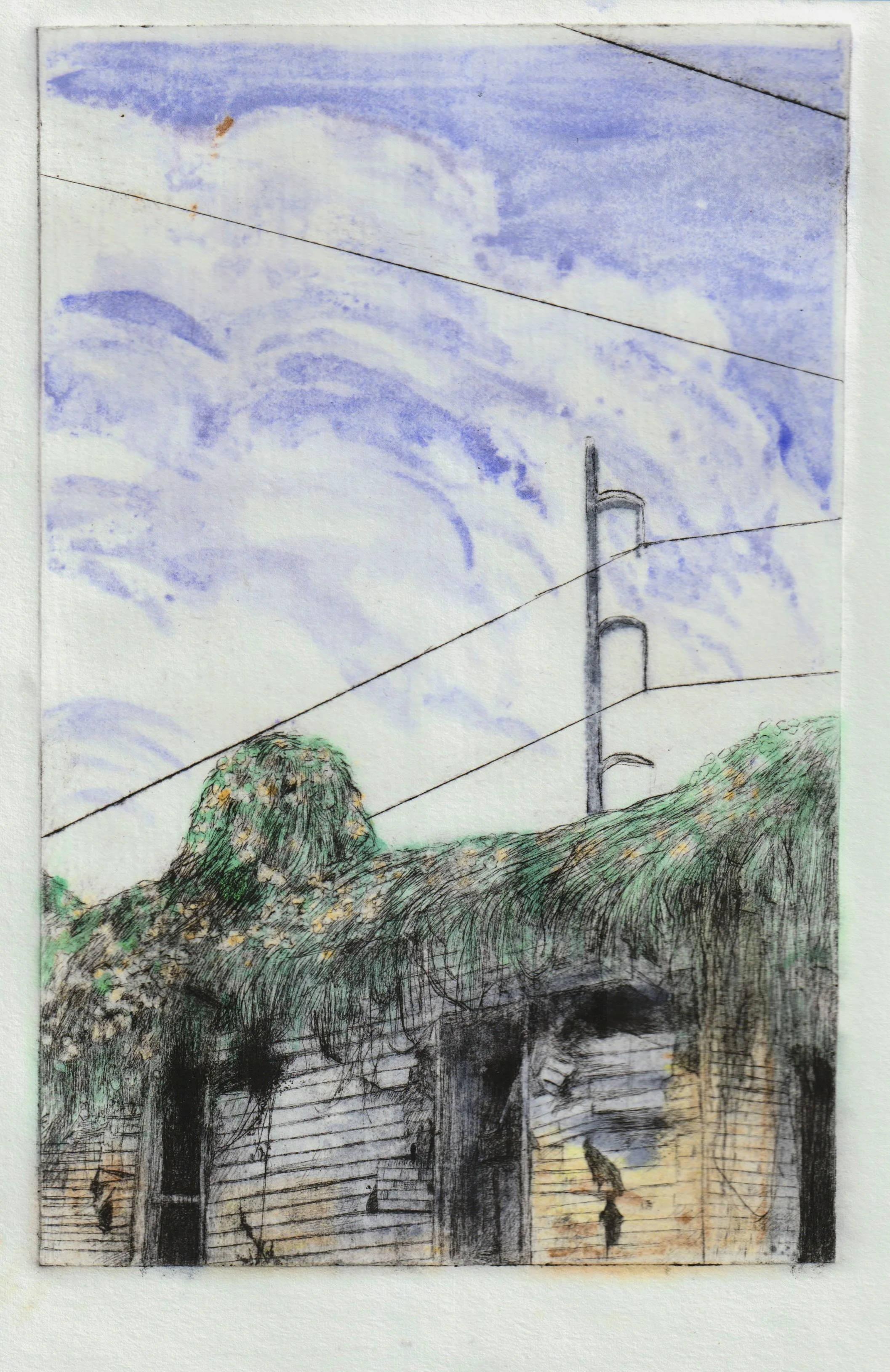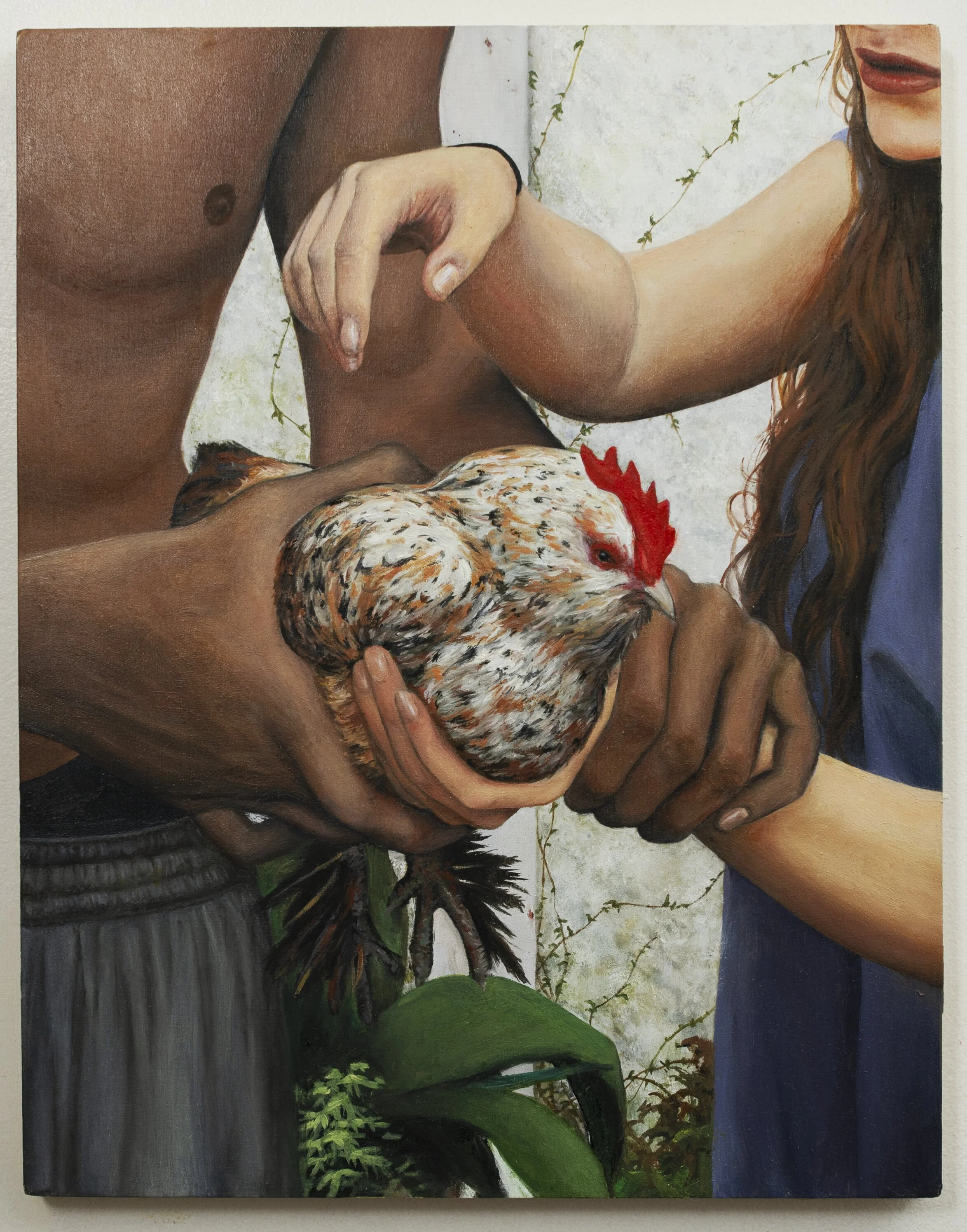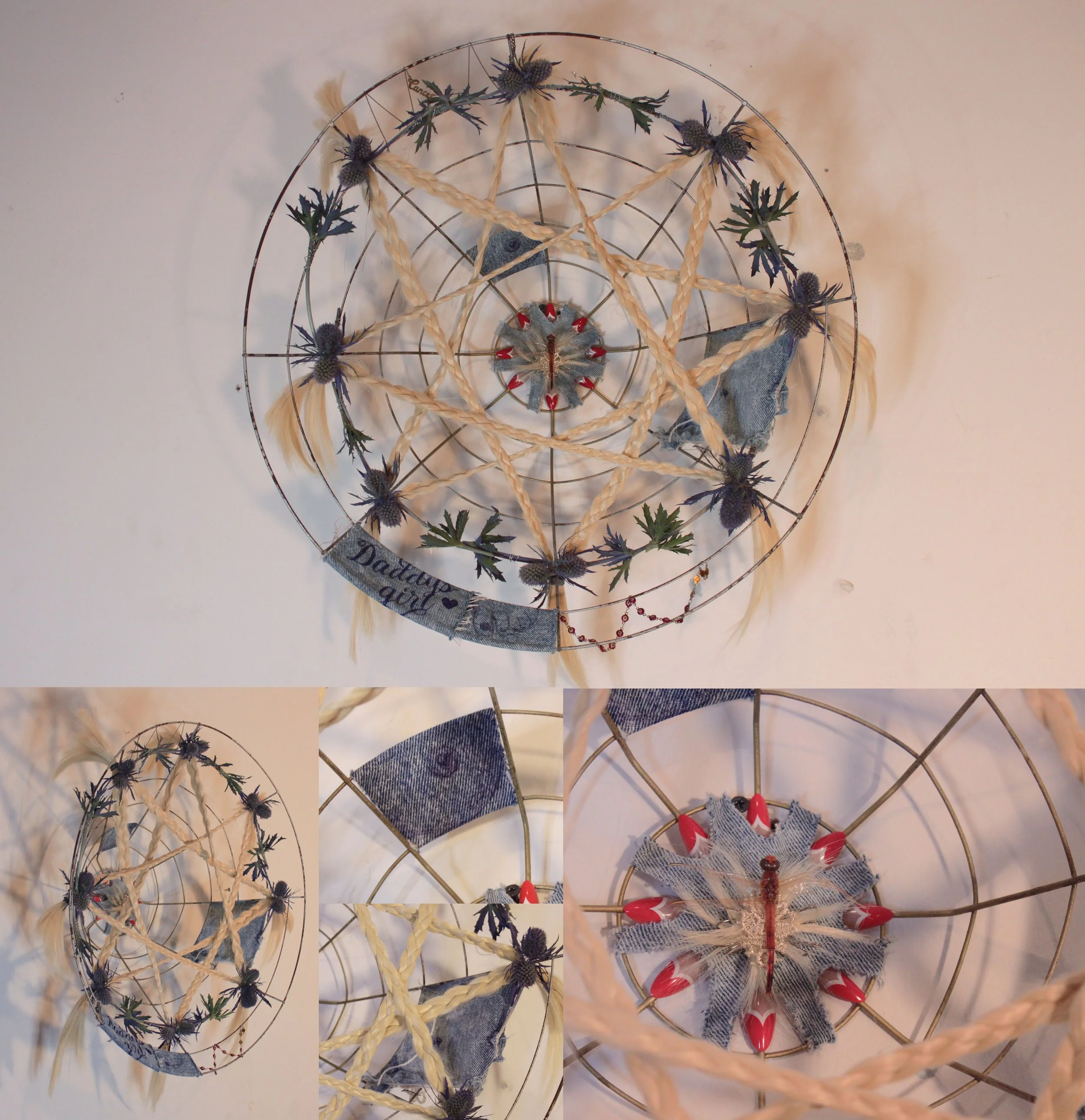 ball-point pen, denim, found organic materials, hair extentions, press-on nails, fishing hooks, wire, lace. 22”×22”