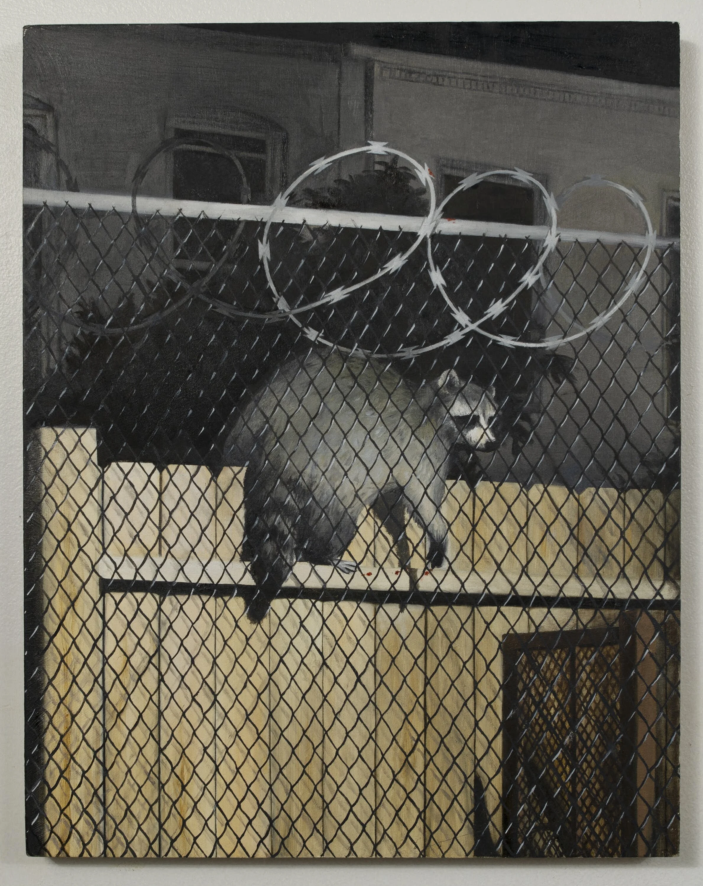scrap metal, house paint, recycled denim, chain, collected objects, silk chiffon, keys, brass cymbal, rope. 18”x30”